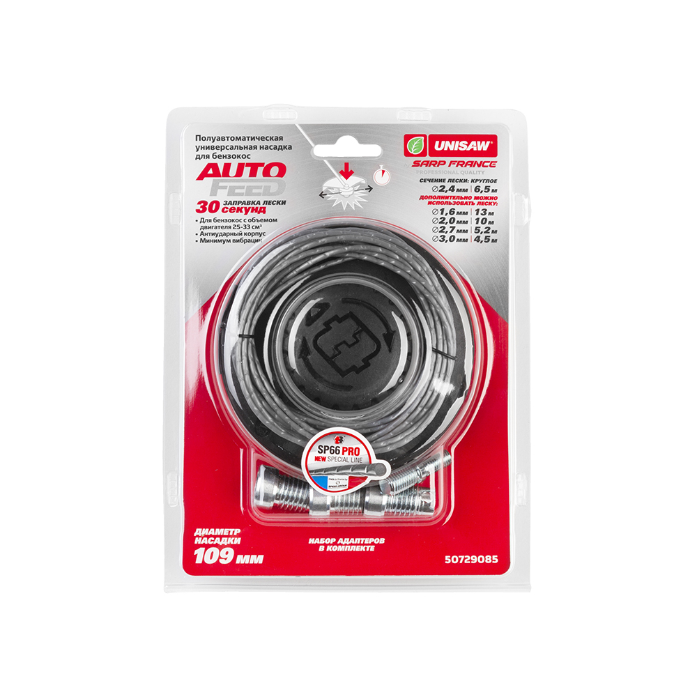 Насадка универсальная Unisaw Professional Quality TAP&GO 109 мм предназначена для бензокос с прямым валом и объемом двигателя 25-33 см³. Корпус из ударопрочного полипропилена гарантирует длительный срок службы насадки. Инновационная износостойкая леска SP66 с особой формой сечения заправлена в насадку. Она обеспечивает отличные режущие способности, снижает расход топлива, а также нагрузку на редуктор и двигатель. Система легкой заправки лески EasyLoad позволяет устанавливать леску в шпулю всего за 30 секунд, без необходимости разбирать насадку. В комплекте набор адаптеров для установки на большинство моделей с прямым (не изогнутым) валом и рабочим объемом от 25 до 33 куб.см.