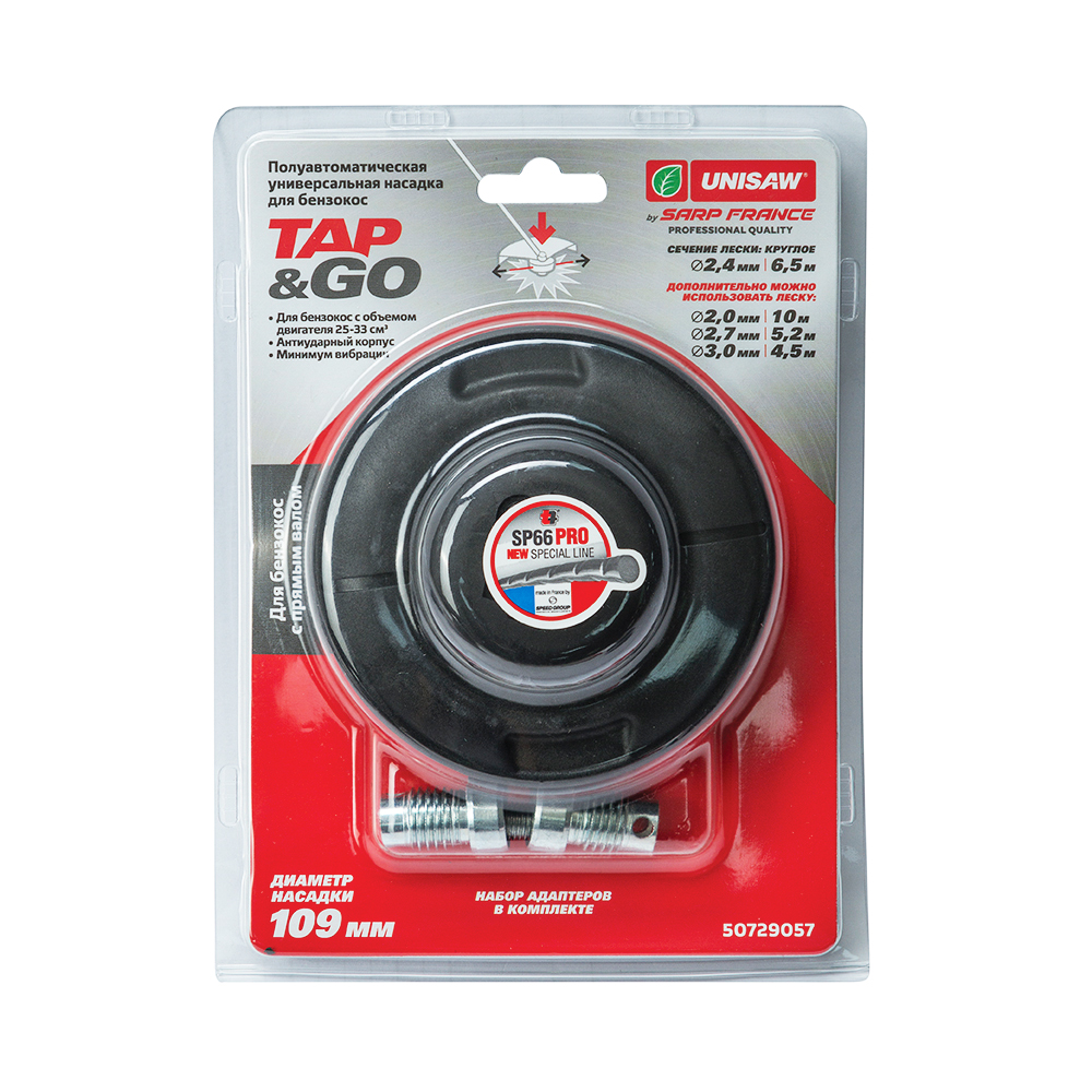 Насадка универсальная Unisaw Professional Quality TAP&GO 109 мм для бензокос с прямым валом и объемом двигателя 25-33 см³. Особенности: Корпус из ударопрочного полипропилена гарантирует длительный срок службы насадки. В комплекте набор адаптеров для установки на большинство моделей с прямым (не изогнутым) валом и рабочим объемом от 25 до 33 куб.см. Инновационная износостойкая леска SP66, заправленная в насадку, с особой формой сечения, обеспечивает отличные режущие способности, снижая расход топлива, а также нагрузку на редуктор и двигатель.