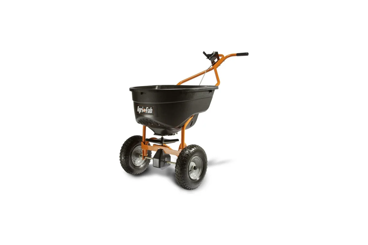 Профессиональный механический разбрасыватель Agri-Fab 45-0462 - прочная и надежная модель, простая в использовании и обслуживании. Большой бункер обеспечивает высокую производительность, увеличивая интервалы между заполнениями. Устройство предназначено для посева газонной травы, внесения удобрений, распределения песка или противогололедного реагента. Большие пневмоколеса Гарантируют высокую маневренность. Бункер и разбрасывающая пластина из высокопрочного полиэтилена Не подвержены коррозии, имеют длительный срок службы. Рычаг управления дозирующим устройством на рукоятке Позволяет включать и отключать подачу разбрасываемого материала. Механический тип Гарантирует простоту использования и не требует проведения обслуживания. Возможность загрузки до 59 кг сухого вещества